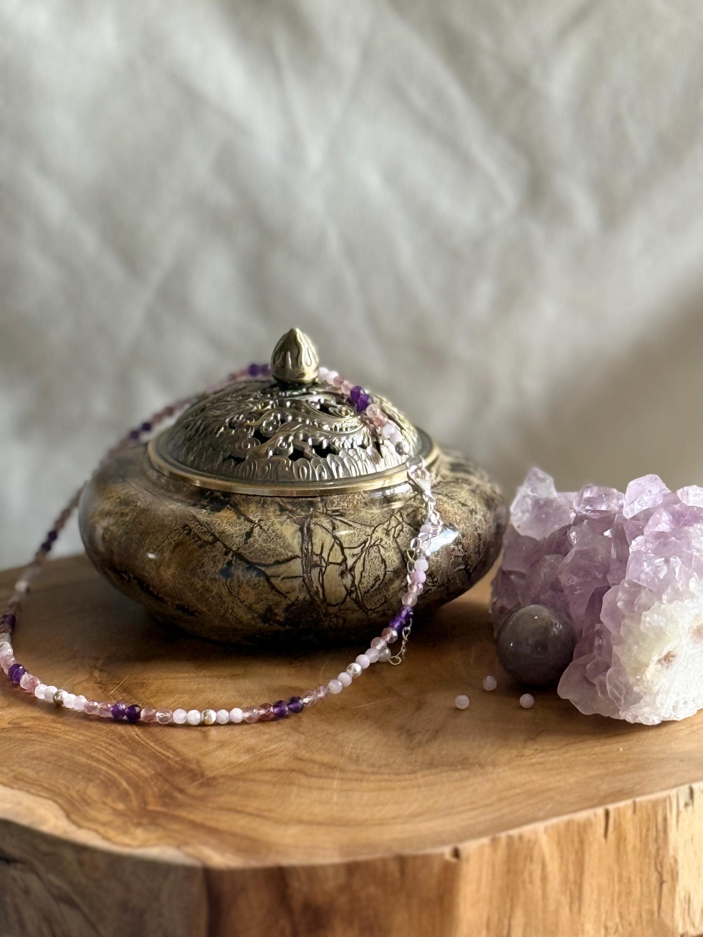 Resting at the throat chakra, my Whispers of Light choker Collection speak to truth, expression, and inner voice. Their crystal pairings are chosen to soften the heart and strengthen your words, helping you move through the world with authenticity, calm confidence, and emotional honesty. They are delicate reminders that your voice deserves to be heard - softly, bravely, and beautifully.