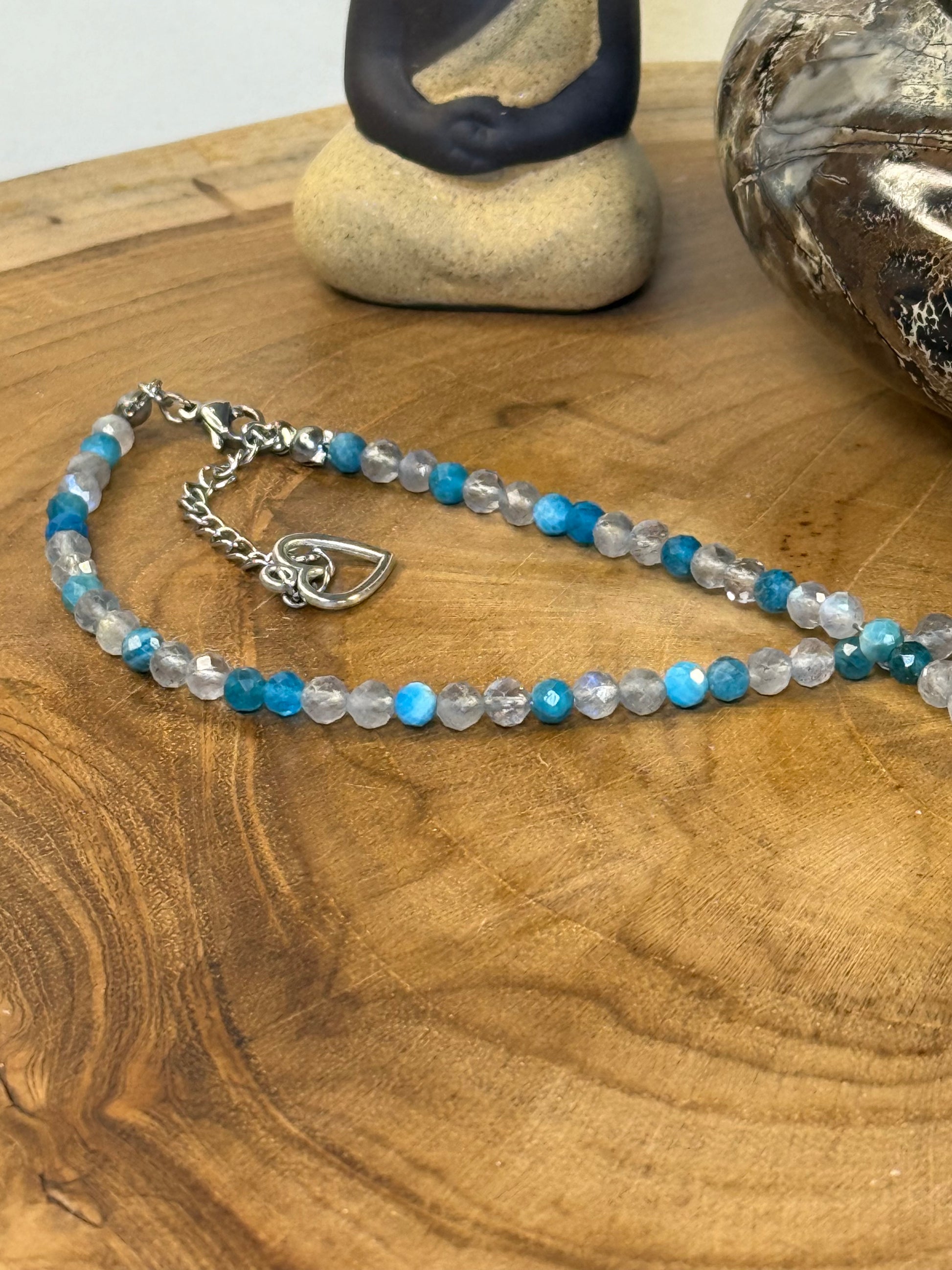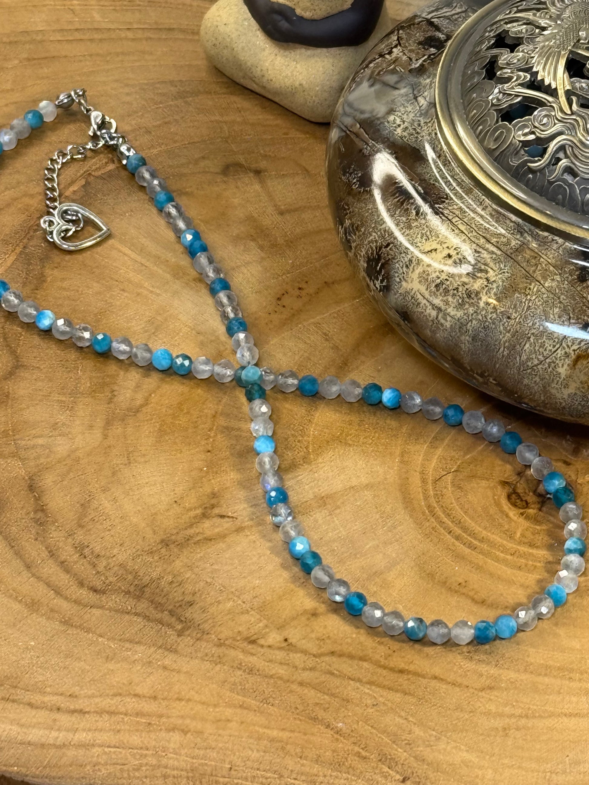 Tap into clarity and spiritual guidance with this 15-inch stainless steel choker, featuring a 2-inch extender, adorned with 4mm faceted Blue Apatite and Labradorite crystals.